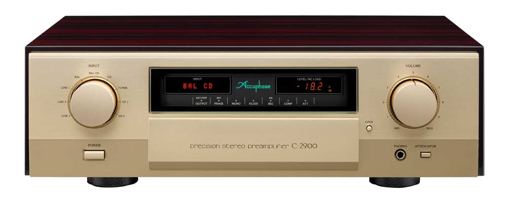 Der Vorverstärker Accuphase C-2900 steht für 50 Jahre unermüdliche Suche nach dem optimalen Vorverstärker-Schaltungsdesign. Im Mittelpunkt stand hierbei u.a. immer die „perfekte“ Lautstärkeregelung, dieses konnte nun dank seiner weiterentwickelten „Balanced AAVA“ Lautstärkeregelung noch weiter realisiert werden. Der C-2900 verfügt vom Eingang bis zum Ausgang über einen vollsymmetrischen Signalweg, alle Verstärkerstufen wurden diskret aufgebaut, die Schaltkreise noch weiter verfeinert.Der C-2900 hat eine konsequente Dual-Mono-Konstruktion mit völlig separaten Baugruppen für die linken und rechten Kanäle, sein 8 mm starken Aluminiumrahmen schirmt elektrische Störungen und Vibrationen wirkungsvoll ab und verhindert so negative Beeinträchtigung des sensiblen Tonsignals. Die überdimensionierte Spannungsversorgung des C-2900 garantiert höchste Stabilität, zwei große Ringkerntransformatoren und insgesamt vier Siebkondensatoren 10000 μF machen das Gerät unempfindlich gegenüber Lastschwankungen. Der C-2900 verfügt über umfangreiche Ausstattung und vielfältige asymmetrische und symmetrische Eingänge und Ausgänge, sowie eine anpassbarer Phasenlage. Für den Genuss analogen Schallplatten steht zudem die passende Phono-Equalizer-Platine AD-2900 zu Verfügung, diese ist sehr einfach im Optionsschacht des C-2900 zu installierten.